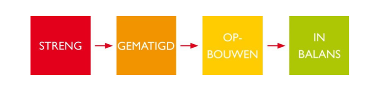 In de eerste fase gebruik je voornamelijk eiwitproducten in combinatie met groente. Vervolgens bouw je stap voor stap maaltijden met vlees, vis, zuivel, fruit en volkorenproducten weer in. Uiteindelijk leer je een evenwichtig voedingspatroon aan.