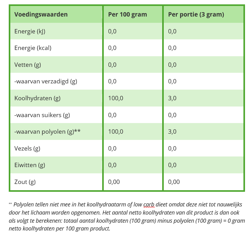 ** Polyolen tellen niet mee in het koolhydraatarm of low carb dieet omdat deze niet tot nauwelijks door het lichaam worden opgenomen. Het aantal netto koolhydraten van dit product is dan ook als volgt te berekenen: totaal aantal koolhydraten (100 gram) minus polyolen (100 gram) = 0 gram netto koolhydraten per 100 gram product.