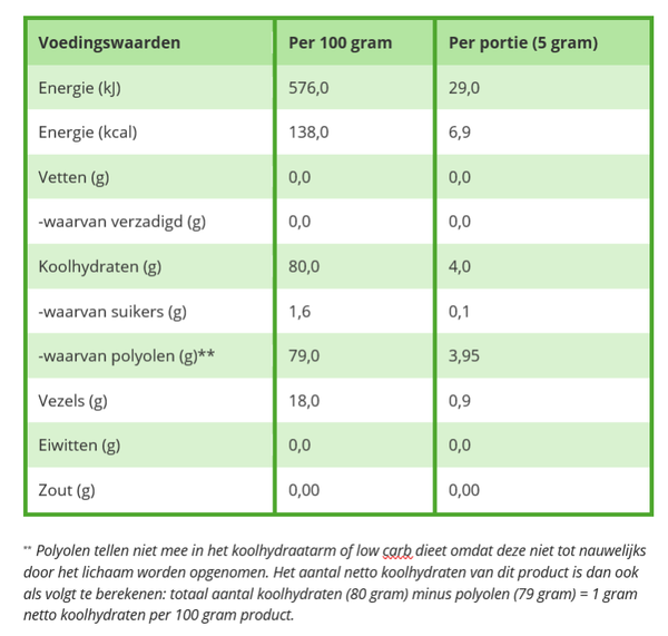 ** Polyolen tellen niet mee in het koolhydraatarm of low carb dieet omdat deze niet tot nauwelijks door het lichaam worden opgenomen. Het aantal netto koolhydraten van dit product is dan ook als volgt te berekenen: totaal aantal koolhydraten (80 gram) minus polyolen (79 gram) = 1 gram netto koolhydraten per 100 gram product.