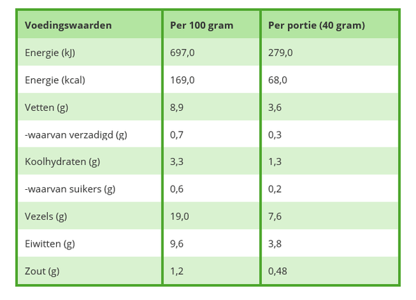 - 1 portie = 40 gram= 1,3 gram koolhydraten