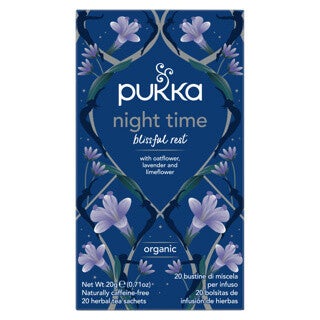 Pukka Thee Night Time wordt ook wel nachtrust thee genoemd enis een biologische kruidenthee met een kalmerende mix van havertoppen, kamille, lavendel en valeriaan. Deze thee bevat 100% biologisch geteelde ingrediënten, duurzaam verbouwd en geïnspireerd door de Ayurvedische leer voor een rustgevende en ontspannen ervaring.