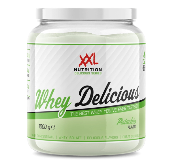 XXL Nutrition Whey Delicious Pistache bevat wei-eiwitten, BCAA's en glutamine en heeft een eiwitpercentage van 80%. Deze shake is lekker romig en levert per portie van 30 gram 23,7 gram eiwit en 1,6 gram koolhydraten.