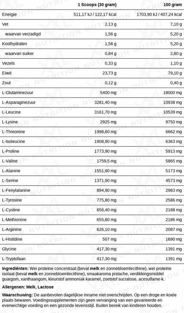 Whey proteïne concentraat (bevat MELK, zonnebloemlecithine), whey proteïne isolaat (bevat MELK, zonnebloemlecithie), smaakaroma pistache, verdikkingsmiddel guargom, xanthaangom, kleurstof ammoniak karamel, zoetstof sucralose; acesulfame-K.