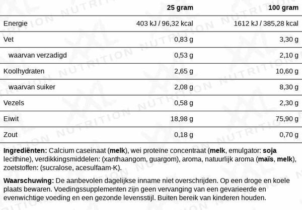 Ingrediënten: Calcium caseïnaat (MELK), wei proteine concentraat (MELK, emulgator: SOJA lecithine), verdikkingsmiddelen: (xanthaangom, guargom), aroma, natuurlijk aroma (mais, MELK), zoetstoffen: sucralose, acesulfaam-K