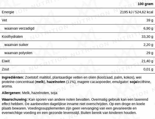 **Polyolen tellen niet mee in het koolhydraatarm of low carb dieet omdat deze niet tot nauwelijks door het lichaam worden opgenomen. Het aantal netto koolhydraten van dit product is dan ook als volgt te berekenen: totaal aantal koolhydraten (33,3 gram) minus polyolen (29 gram) = 14,3 gram netto koolhydraten per 100 gram product.