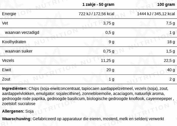 Chips (SOJAeiwitconcentraat, tapioca- en aardappelzetmeel, vezels (SOJA), zout, aardappelvlokken, emulgator: SOJAlecithine), zonnebloemolie, acacaiagom, natuurlijk aroma, gedroogde rode paprika, gedroogde basilicum, biologische gedroogde knoflook, cayennepeper, zoetstof sucralose.