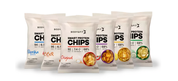 De Smart Chips wordt niet gebakken of gefrituurd, maar bereid door middel van hete lucht. Deze bereidingsmethode maakt de chips heerlijk krokant. Daarnaast zorgt het ervoor dat onze chips gemiddeld 68% minder vet dan reguliere chips bevat*. Smart Chips zit daarnaast ook nog eens boordevol hoogwaardige eiwitten, tot wel 30%. Smart Chips hebben niet alleen een verlaagd vetgehalte, ze zijn ook hoog in eiwitten met minimaal 6,7 gram eiwitten per zakje. Onze chips is verkrijgbaar in meerdere overheerlijke smaken, die op smaak zijn gebracht met een heerlijke kruidenmix.