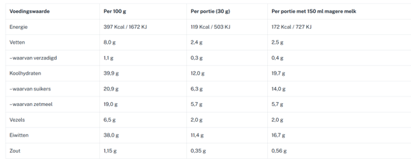 - Levert per portie van 30 gram (=2 schepjes) 12 gram koolhydraten en 11,4 gram eiwit