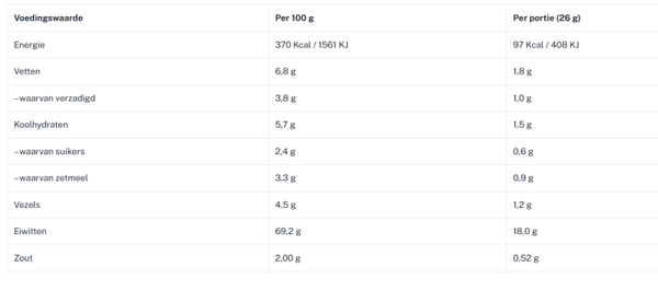 - Levert per 100 gram 5,7 gram koolhydraten en 69,2 gram eiwit