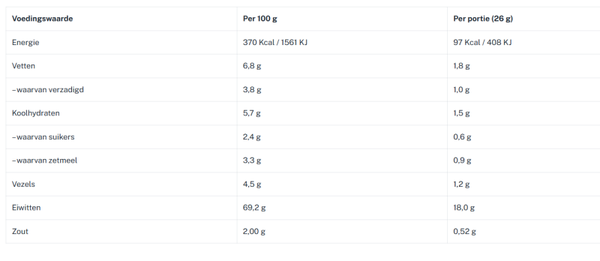 • Levert per 100 gram 5,7 gram koolhydraten en 69 gram eiwit